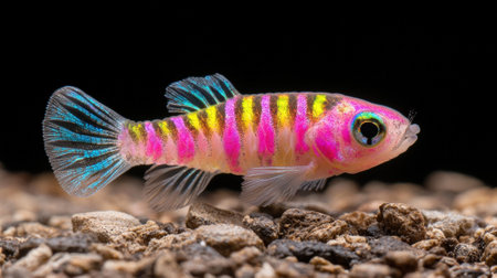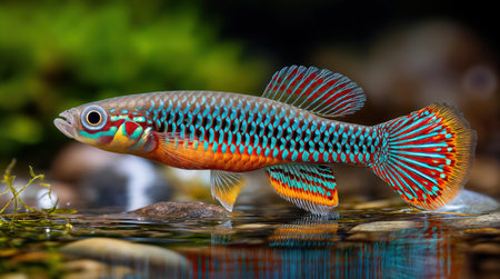 A vibrant killifish from the Aplocheilidae family swimming gracefully in clear freshwater among aquatic plants, showcasing its bright colors and natural habitat.