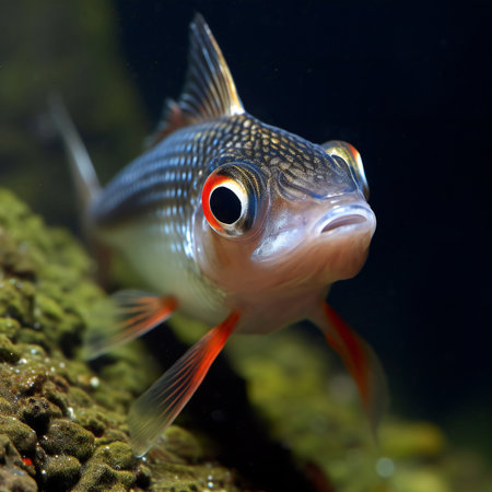 A fish with big eyes and a red mouth is looking at the camera. The fish is in a dark environment, which makes it stand out even more