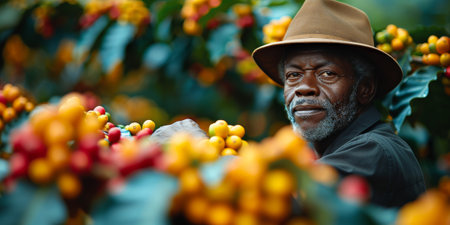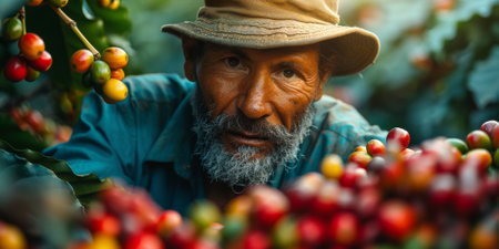 Man picking coffee beans on a sunny day. Coffee farmer is harvesting coffee berries. Brazil