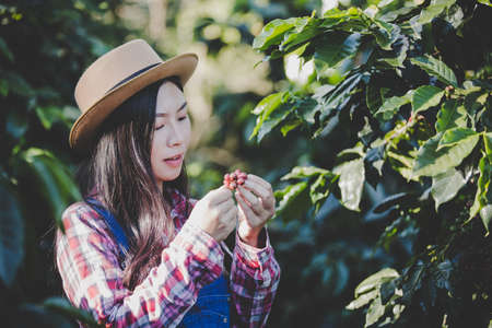 Akha farmers, women, smiling and picking a bunch of coffee beans from a coffee tree which is a coffee product of a tribe in northern Thailand