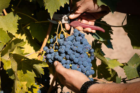 Man picking grapes: Manually picking blue grapes on vineyards to make wine. Wine making, vineyards, tourism business, small and private business, chain restaurant, flavorful food and drinks