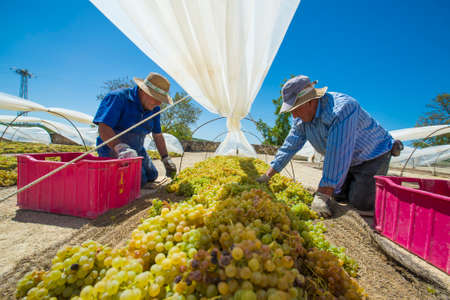 JEREZ DE LA FRONTERA, SPAIN - AUGUST 21: Farm worker putting grapes Pedro ximenez for soleus to turn into raisins and make sweet wine PX. on aug 21, 2014 in Jerez de la frontera