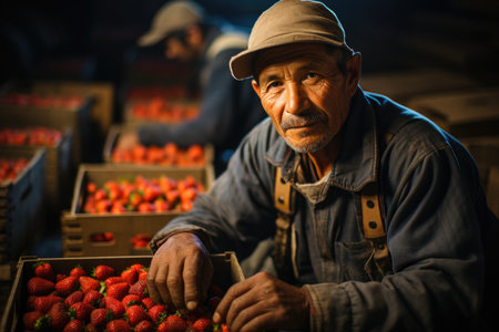 Ripe Strawberry in wooden box or crates in an agricultural field plantation with, generative AI