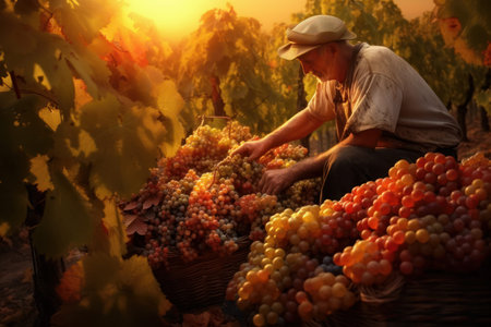 A vineyard worker gathers ripe grapes in a colorful autumn vineyard, showcasing the beauty of nature and the hard work of farming during harvest season.
