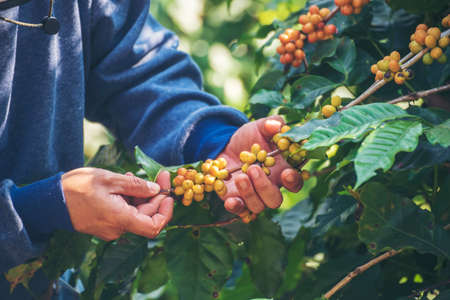 Man Hands harvest coffee bean ripe Red berries plant fresh seed coffee tree growth in green eco organic farm. Close up hands harvest red ripe coffee seed robusta arabica berry harvesting coffee farm