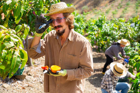Young agronomist with sunglasses inspecting avocado tree, organic and eco harvest