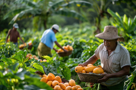 Farmers carrying baskets full of ripe papayas during harvest time in a tropical plantation