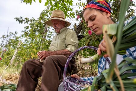 Old man in a straw hat cutting vegetables sitting on a log while his granddaughter helps him