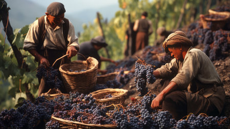 A group of men working together to harvest grapes from a vineyard, Workers harvesting grapes, a bounty of nature's finest, AI Generated