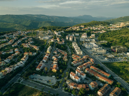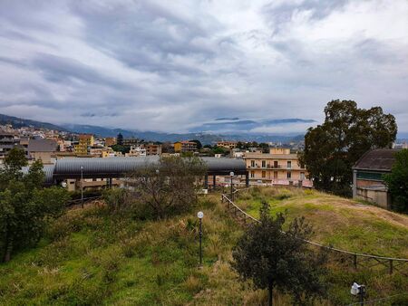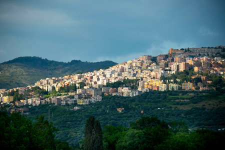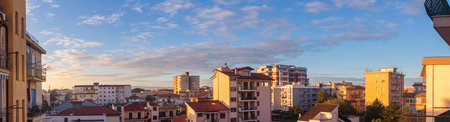Montesilvano, Italy. May 19, 2019: Idyllic hilly landscape with houses and cloudy sky over sunset. Montesilvano, Italy.