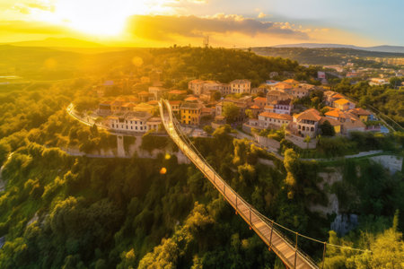 A stunning landscape showcases a medieval castle perched on a hill, surrounded by charming rooftops and vibrant autumn colors under a golden sunset sky.