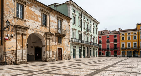 This image captures the essence of Piazza Garibaldi, showcasing its colorful buildings, intricate paving, and architectural charm, creating a vibrant urban landscape.