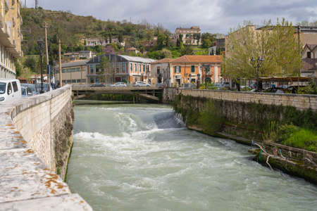 Isola del Liri, Italy - April 07, 2021, Rough river in Isola del Liri in Lazio, Italy