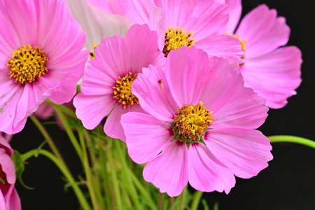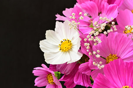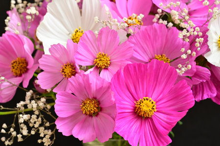 Beautiful bouquet of pink and white cosmos flowers on black background