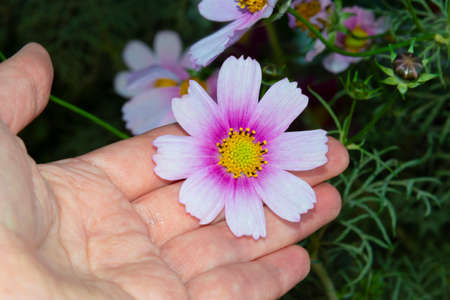 Excellent flower Cosmos bipinnatus close-up. Delicate pink fresh petal with a bright magenta edge, horizontal nature