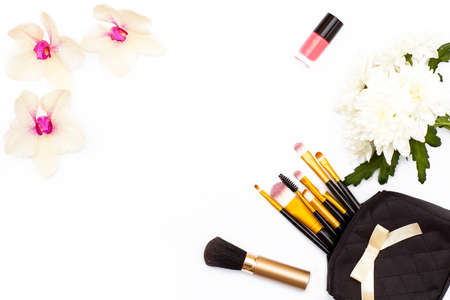 makeup brushes, pink nail Polish, Orchid and chrysanthemum flower on a white background. Beauty concept. Top view. Flat lay