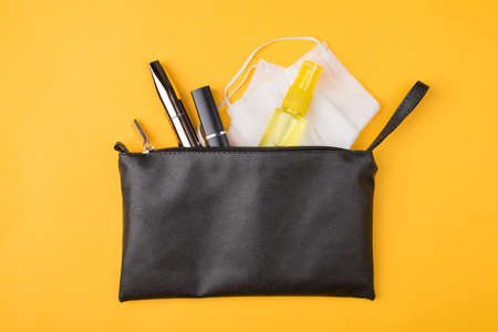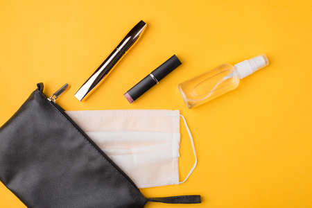 Mask and hand sanitizer as normal part of daily life concept. Top above overhead view flat-lay photo of a cosmetic bag with a mask and hand sanitizer isolated on yellow background