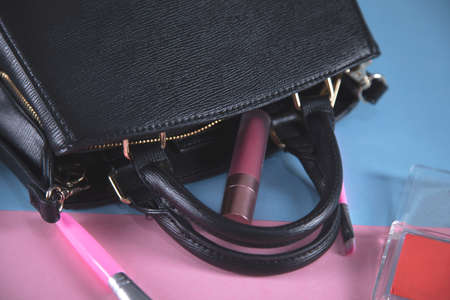 womens handbag with cosmetics, makeup tools and accessories on a blue background, beauty, fashion, shopping concept, flat lay
