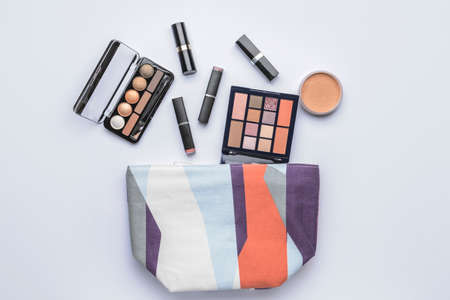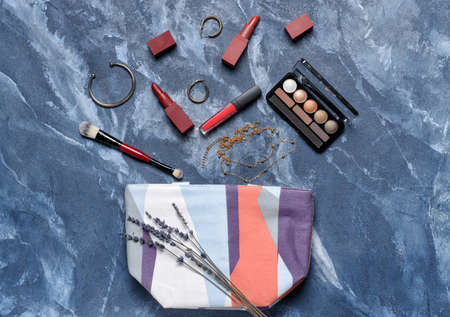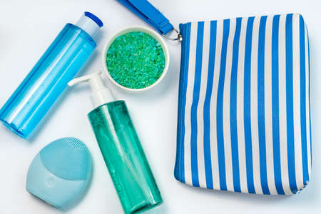 Cosmetic bag and makeup products in white on a blue background. Objects on the table, top view, flat lay