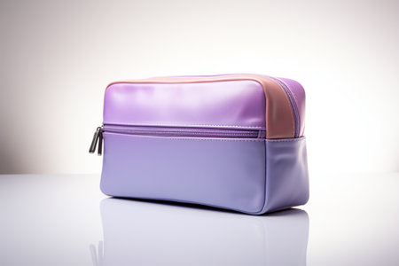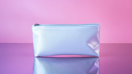 This image features a sleek white cosmetic bag placed on a glossy surface, complemented by a soft pink background. Ideal for showcasing beauty and fashion.