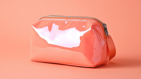 This stylish glossy coral cosmetic bag features a zip closure and handle, perfect for organizing beauty essentials while traveling. It offers a fresh and modern look.