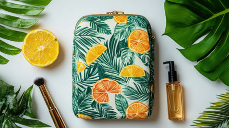 A vibrant tropical cosmetic bag featuring a lively print of citrus fruits and lush green leaves, perfect for travel organization and aesthetics.