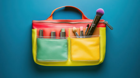 A stylish and vibrant cosmetic bag filled with various makeup brushes and lipsticks, resting on a bright blue background, perfect for beauty enthusiasts.