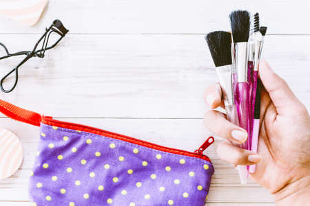 cropped view of woman holding cosmetic bag with makeup products on blurred background. Woman holding a makeup bag