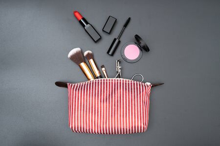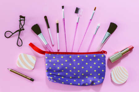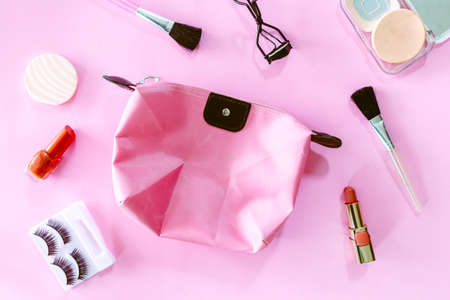 Woman cosmetic bag, make up beauty products on pink background. Makeup brushes and pink lipstick. Top view, flatlay. Decorative cosmetics. Copyplace, place for text