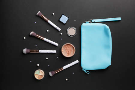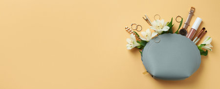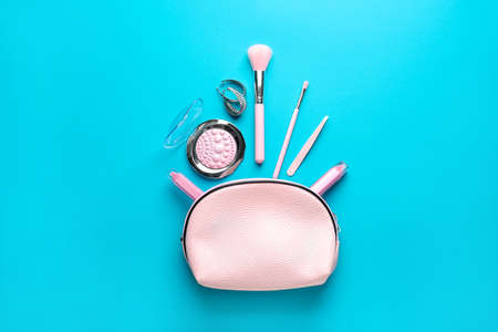 Make-up cosmetic bag on blue background. Stylish makeup artist pouch with beauty products. Top view with copy space. Beauty salon banner design template