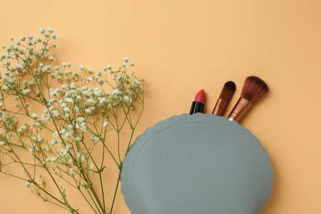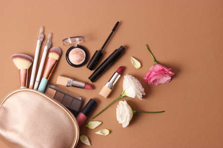Cosmetic bag with cosmetics, jewelry and alstroemeria on beige background