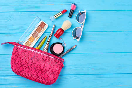 Female cosmetics and accessories composition. Pink cosmetics bag with makeup products spilling out on to a blue wooden background, top view.