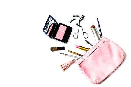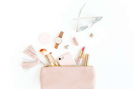 Flat lay of pink leather woman bag open out with cosmetics over white background. Fashion and beauty.