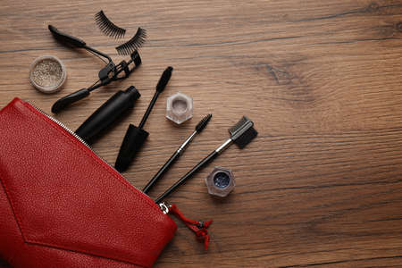 Flat lay composition with eyelash curler, makeup products and accessories on wooden table. Space for text