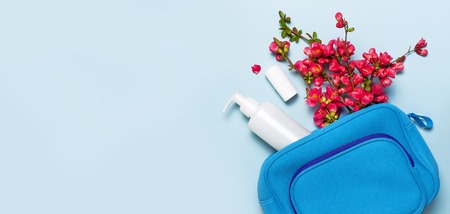 Female cosmetics bag, cosmetic products, white cosmetic containers, pink flowers on pastel blue background top view flat lay copy space. Minimalism cosmetics style. Skin care concept.