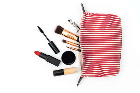 Flat lay composition with pink cosmetic bag with cosmetic makeup products, isolated on white background. Flat lay, top view.