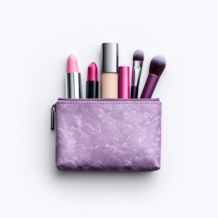Stylish purple makeup pouch filled with lipsticks, foundation, and cosmetic brushes on a clean white background for beauty and fashion themes
