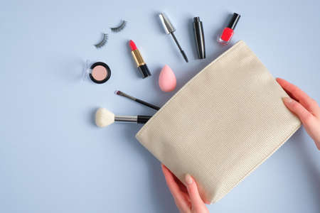 Make-up cosmetic bag in female hands on blue background. Stylish makeup artist pouch with beauty products. Flat lay, top view