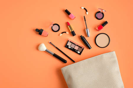 Cosmetics bag with makeup products spilling out on pastel peach background. Flat lay, top view