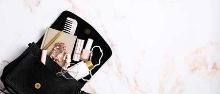 Elegant women's handbag with cosmetics and accessories on marble background. Beauty blog banner design. Flat lay, top view, copy space.