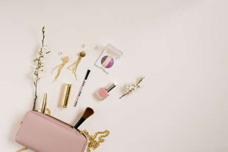 Women's desk with cosmetics, which lies next to a pink bag or cosmetic bag with copying space, apple tree flowers on a beige background. Top view. It was flat. The composition of the frame for mother's day or for a blogger.