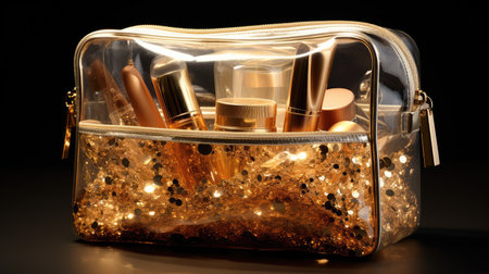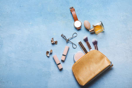 Golden cosmetic bag with cosmetic beauty products on a light background. Template for feminine blog social media.
