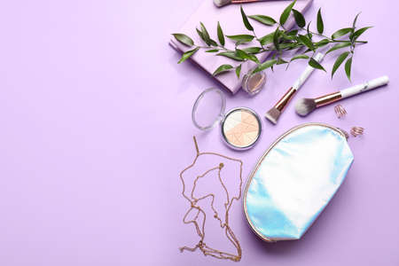 Cosmetics top view on pastel pink and purple table. Workplace and cosmetic bag.