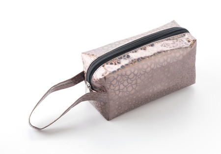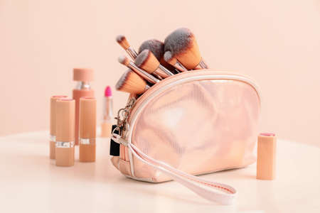 makeup bag over pink background empty make up cosmetics pouch with cosmetics on top, beige