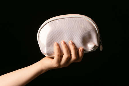 Hand with beautiful manicure holding cosmetic bag on dark background