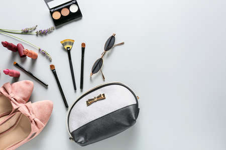 Female bag with makeup cosmetic products and paper notebook on white desk table. Flat lay, top view.