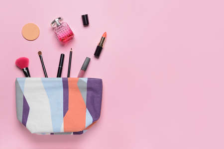 Cosmetics on the table at the woman. Cosmetic bag, cosmetic and hygiene products. Pink background for text