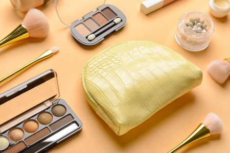 makeup kit. Women's cosmetics in a cosmetic bag and makeup brushes on a yellow bright background. women things. top view