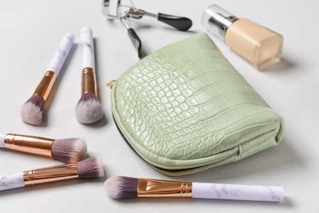 Stylish cosmetic bag, brushes, makeup foundation and eyelash curler on light background, closeup