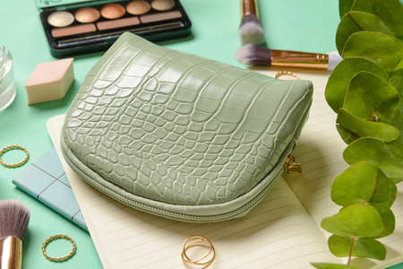 Professional makeup cosmetic set, with summer tropical leaves, woman bag. Make up items.